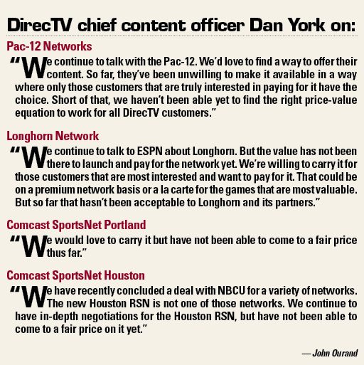 The company that was the first to sign a carriage deal for the Big Ten Network has not been able to reach deals for the Longhorn Network or Pac-12 Networks. The distributor that was the first to make all out-of-market MLB, NBA and NHL games available in high-definition has not been able to reach deals with several regional sports networks.