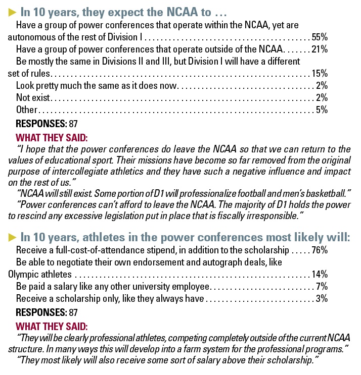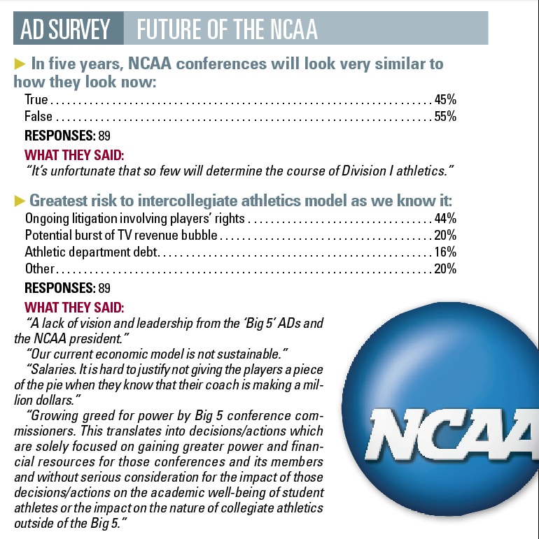 SportsBusiness Journal partnered with NACDA to survey Division I athletic directors on a variety of issues affecting college athletics, from the future of NCAA conferences and governance, to revenue growth and pay for student athletes. Turnkey Intelligence provided technical expertise and conducted the online survey from May 8-21. A total of 93 athletic directors responded. Here are the highlights: